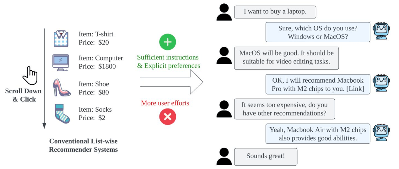 LLM-based 生成式推荐,则可以利用 LLM 强大的自然语言理解和生成能力,通过对话方式叠加购买记录/用户行为,给出推荐: