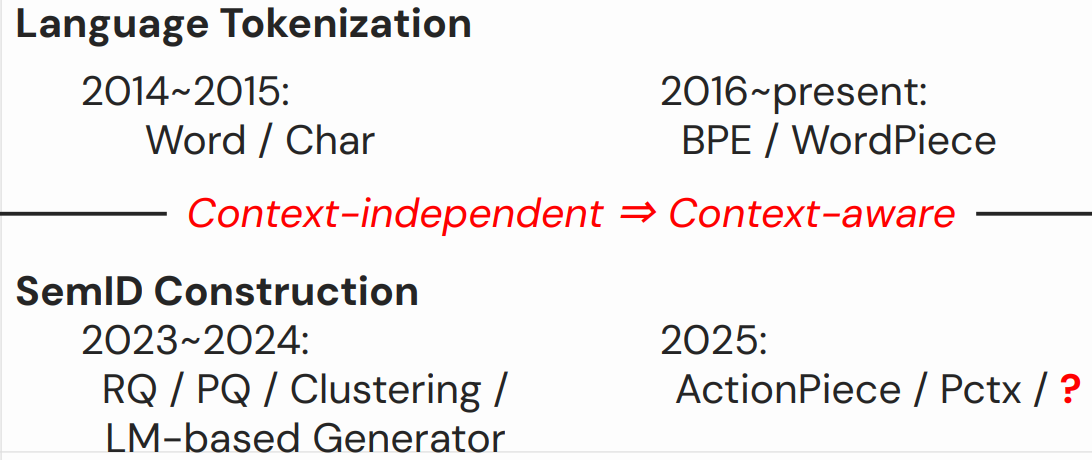 - Hou et al. ActionPiece: Contextually Tokenizing Action Sequences for Generative Recommendation. ICML 2025.