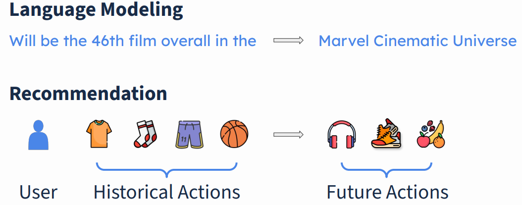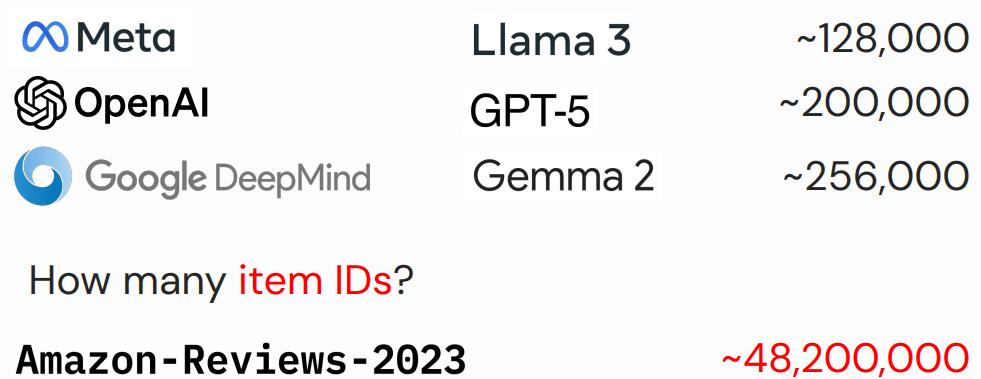 | 推荐模型 | 稀疏的“用户-物品”交互数据(Sparse user-item interactions) | Item token | 10^9 |