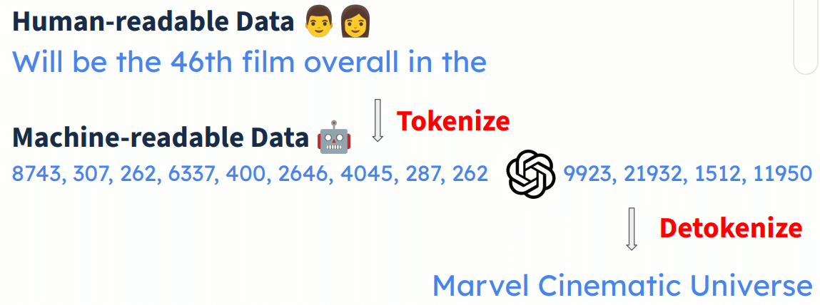 语言模型的 tokenize 和 de-tokenize 过程如下,更多信息可参考 如何训练一个企业级 GPT 助手(OpenAI,2023)。