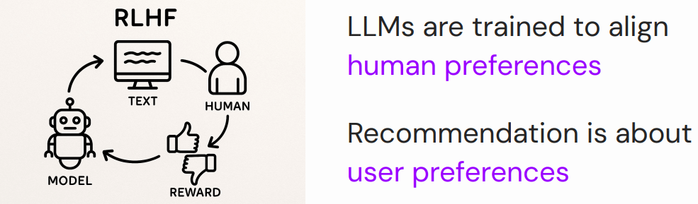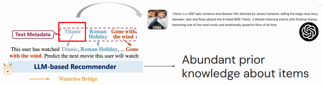 - 优点:基于文本的推荐本身就是 LLM 的工作机制,底层数据分布与 LLM 是对齐的;