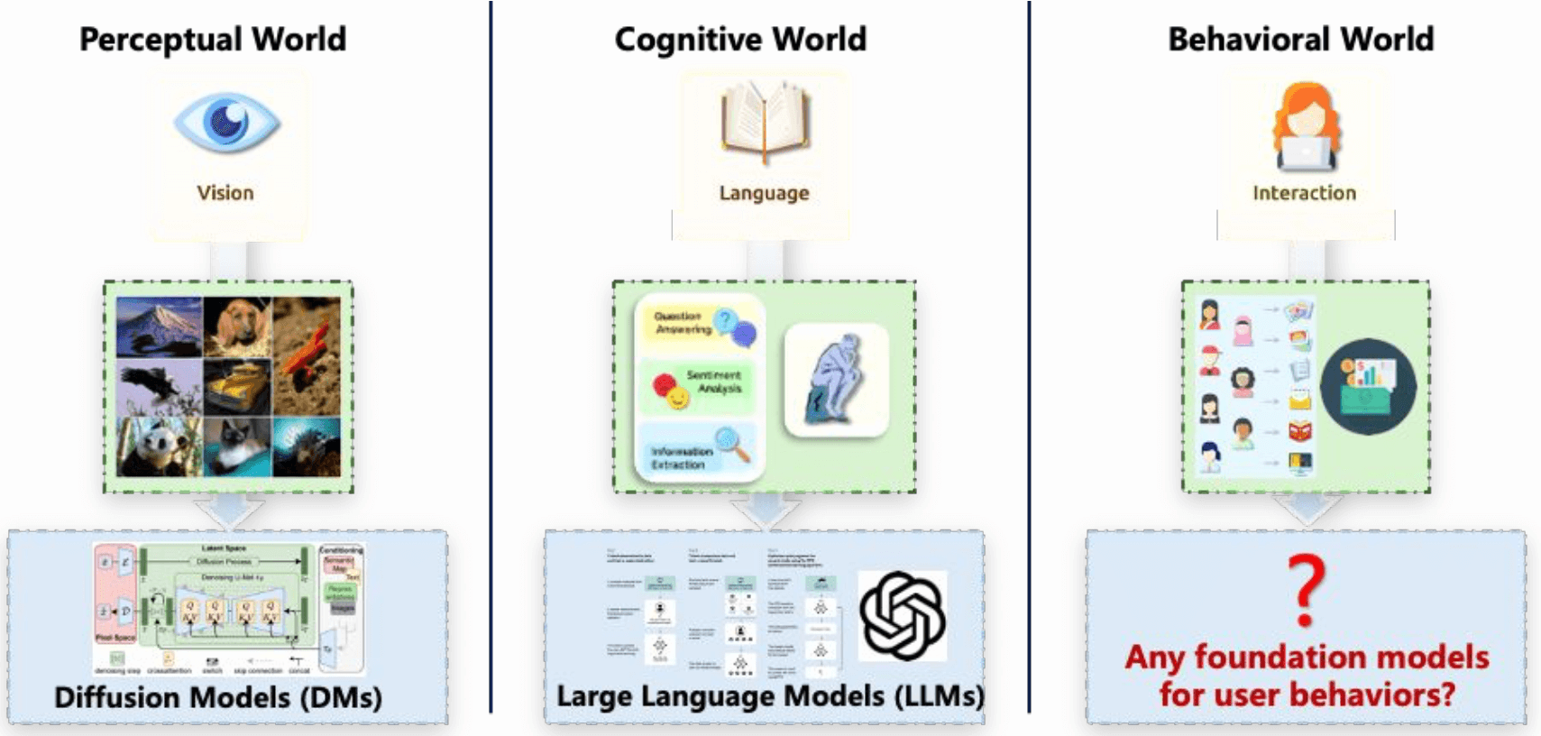 从模型和现实世界的对应关系来看,感知世界(Perceptual World)和 认知世界(Cognitive World) 都已经有了对应的大模型类型,分别基于视觉(Vision)和语言(Language) 建模, 并且基本都是基于生成式架构,实际效果非常好。
