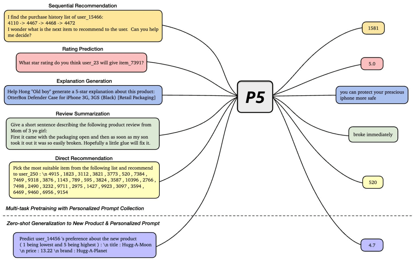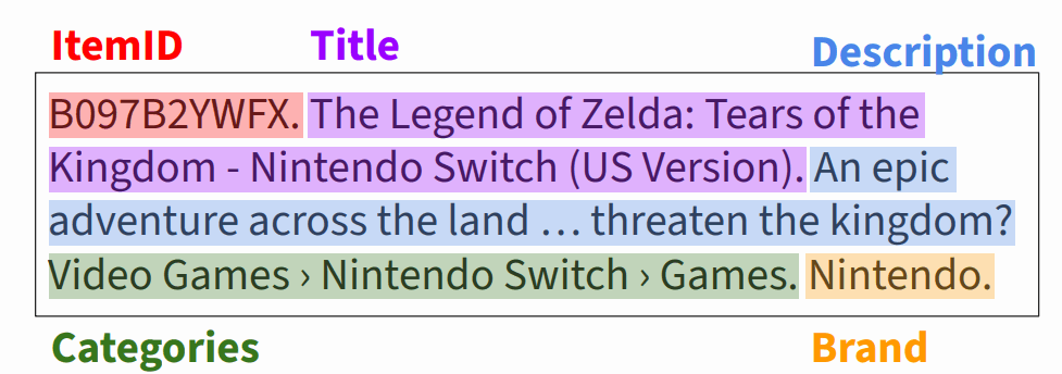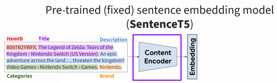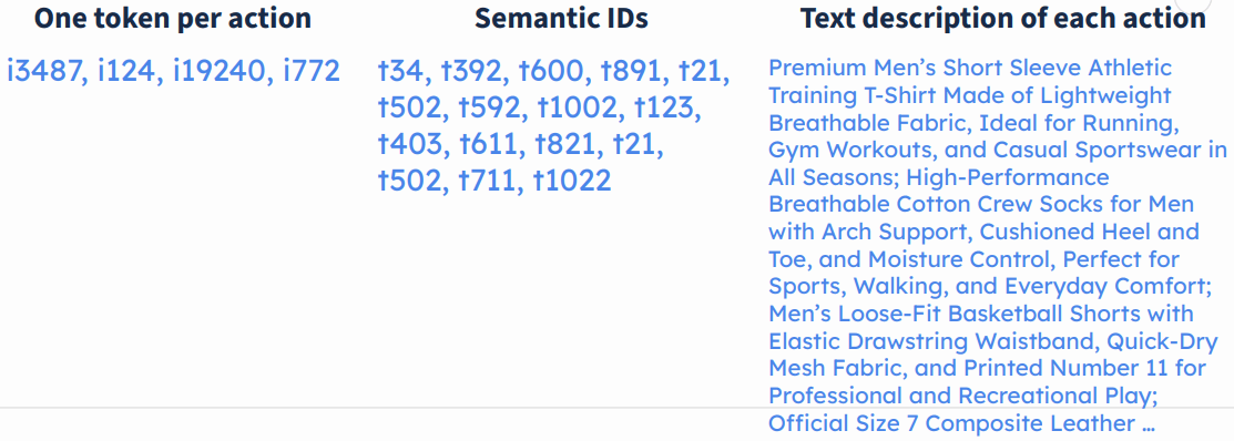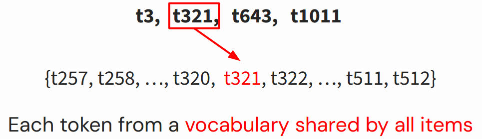 例如在下图的商品推荐场景,输入是用户购买过的四个商品,token 化之后就是四段分别描述这四个商品的纯文本: