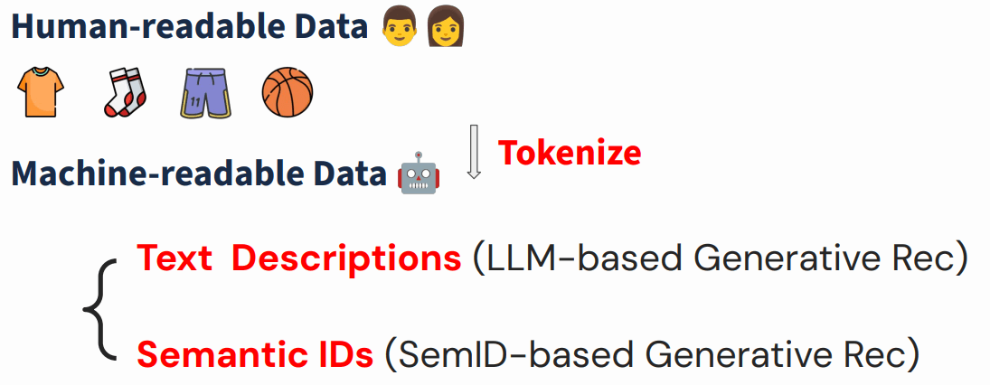 - Tokenize 为文本:LLM-based Generative Rec(基于大语言模型+文本描述的生成式推荐);