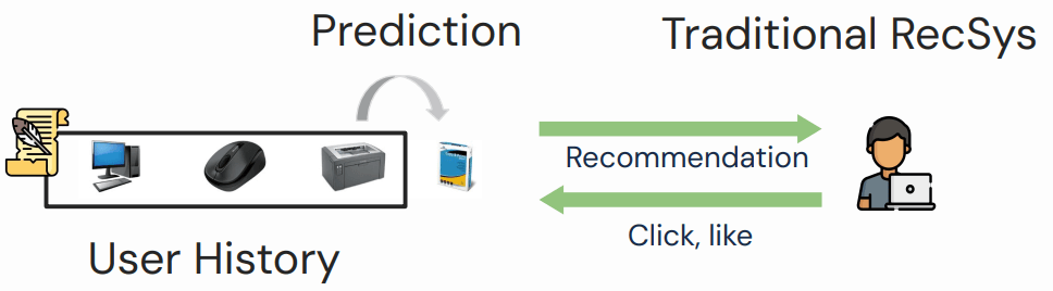 传统推荐系统主要是利用用户的历史购买记录和用户行为来预测接下来的购买行为: