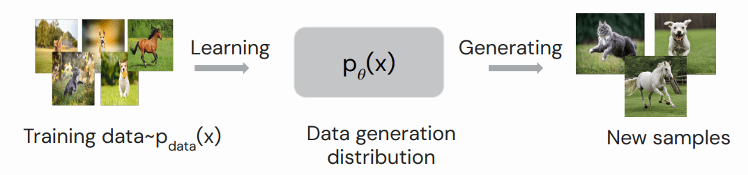 生成式模型从大量给定样本中学习到底层的数据分布(underlying distribution of data), 然后就能生成新的样本(generate new samples)。如下图所示,在学习了大量动物图文之后, 模型就能根据给定指令生成动物照片(“奔跑的猫/狗/马”),