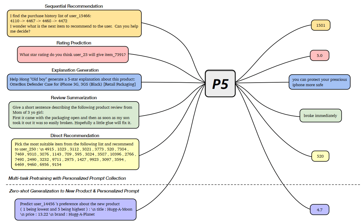 这种范式我们称为 “Pretrain, Personalized Prompt, and Predict Paradigm” (预训练、个性化提示与预测范式),缩写为 P5。