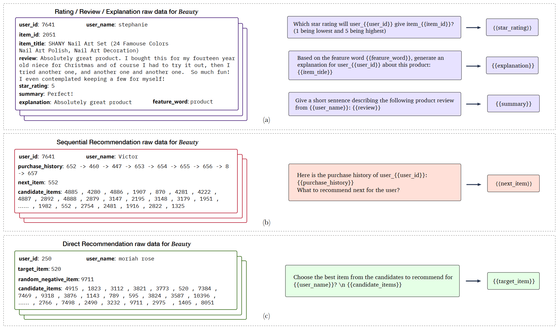 受这些方法成功的启发,我们创建了一个个性化提示集, 然后在一个多样化的推荐任务上训练一个 sequence-to-sequence 模型。