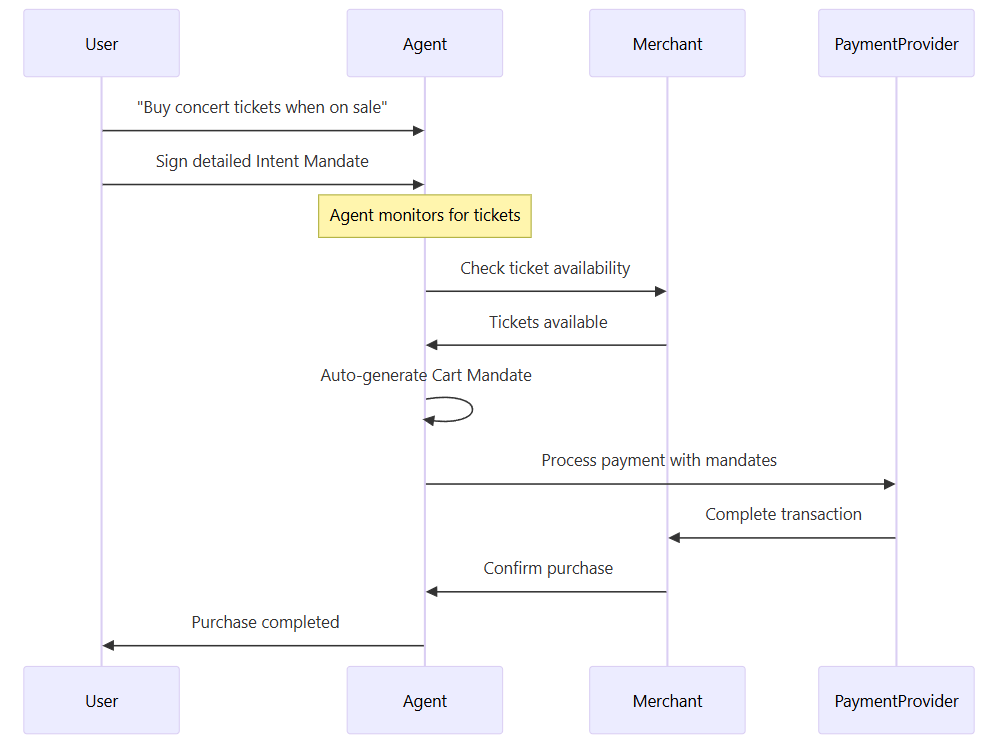 User -> Agent: “Buy concert tickets the moment they go on sale”.Agent: the user signed a detailed Intent Mandate upfront. This mandate specifies the rules of engagement—price limits, timing, and other conditions.Agent -> Merchant Agent & Credential Provider Agent: automatically generate a Cart Mandate on behalf of user once the precise conditions are met.