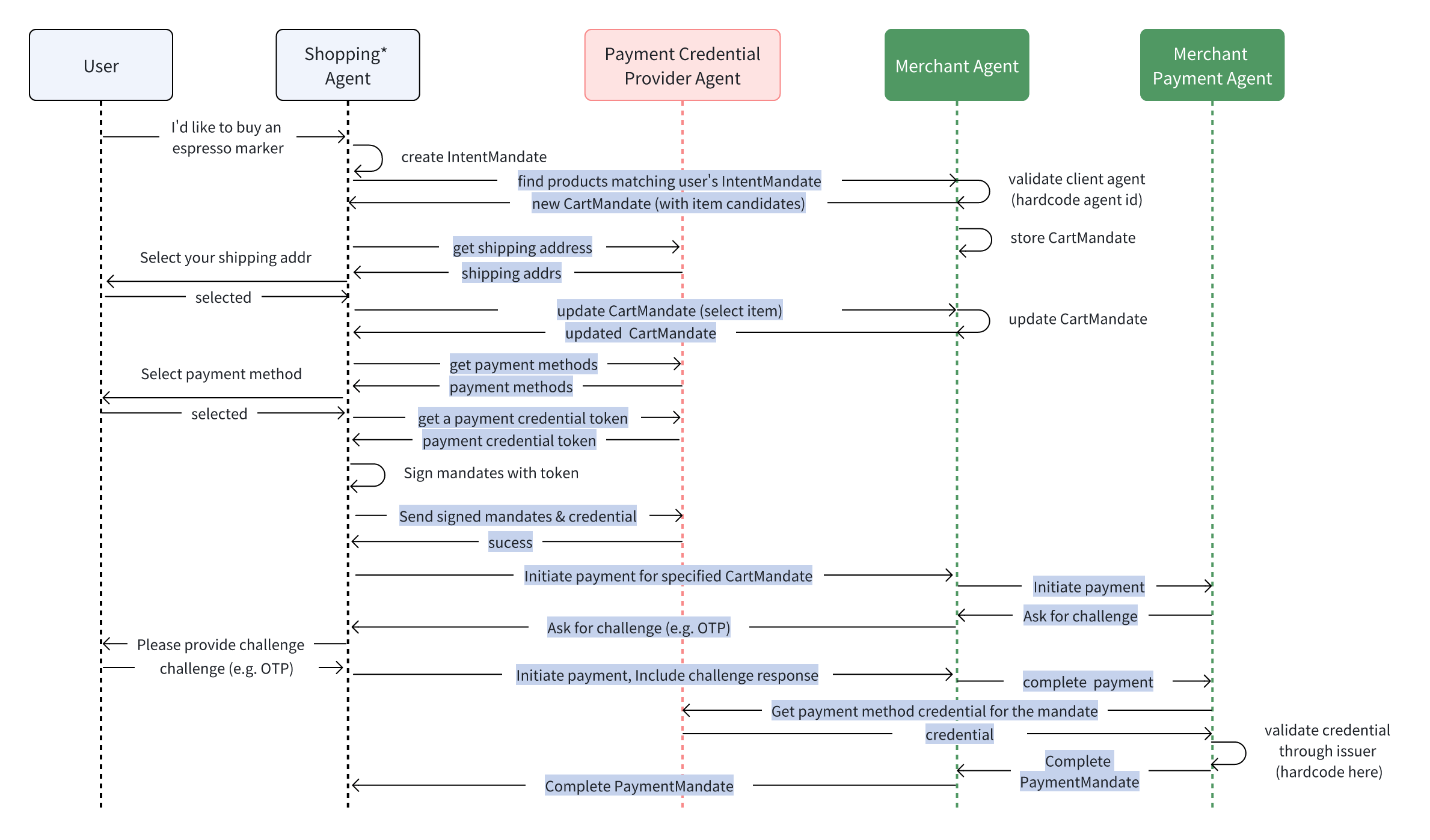 ShoppingAgent -> MerchantAgent: Find products matching user’s IntentMandateShoppingAgent -> PaymentCredentialProviderAgent: Get the user’s shipping addressShoppingAgent -> MerchantAgent: Update the cart with the user’s shipping addressShoppingAgent -> PaymentCredentialProviderAgent: Get a filtered list of the user’s payment methodsShoppingAgent -> PaymentCredentialProviderAgent: Get a payment credential token for the user’s payment methodShoppingAgent -> PaymentCredentialProviderAgent: This is the signed payment mandateShoppingAgent -> MerchantAgent: Initiate a paymentMerchantAgent -> MerchantPaymentAgent: Initiate a paymentShoppingAgent -> MerchantAgent: Initiate a payment. Include the challenge response.MerchantAgent -> MerchantPaymentAgent: Initiate a payment (include the challenge response)MerchantPaymentAgent -> PaymentCredentialProviderAgent: Give me the payment method credentials for the given token