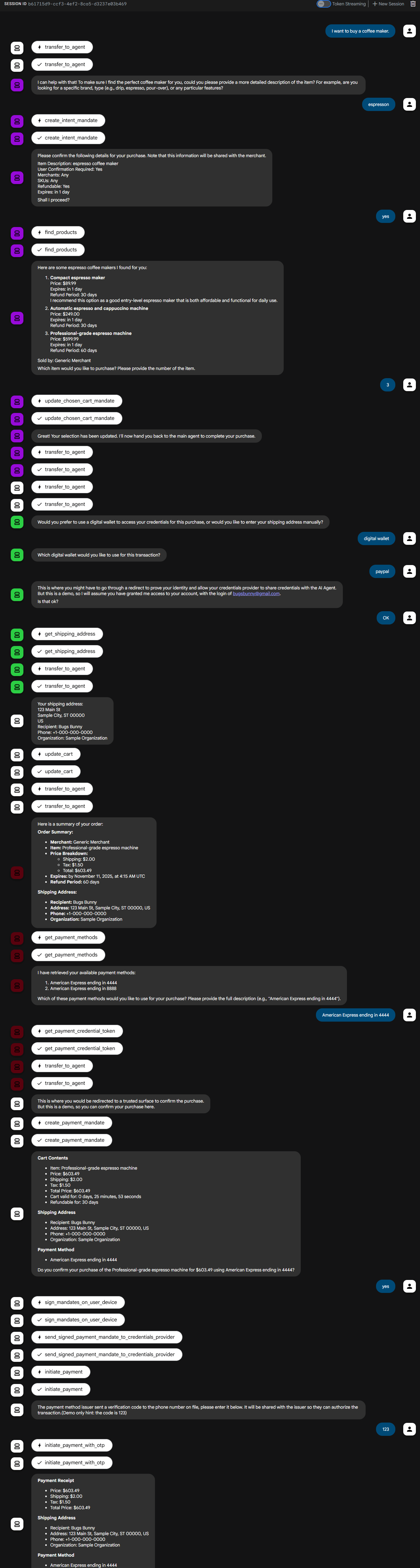Below is an intact chat session, from first query to payment completing. Note that this example is designed to demonstrate the various capabilities and steps within AP2, which is why it may appear intricate. In practice, the process can be more streamlined than shown here.