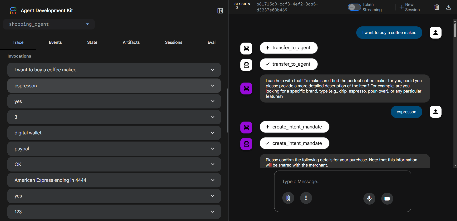 [An Intent Mandate was in the request Data] {'user_cart_confirmation_required': True, 'natural_language_description': 'espresso coffee maker', 'merchants': [], 'skus': [], 'requires_refundability': True, 'intent_expiry': '2025-11-12T03:45:42.037007+00:00'}
