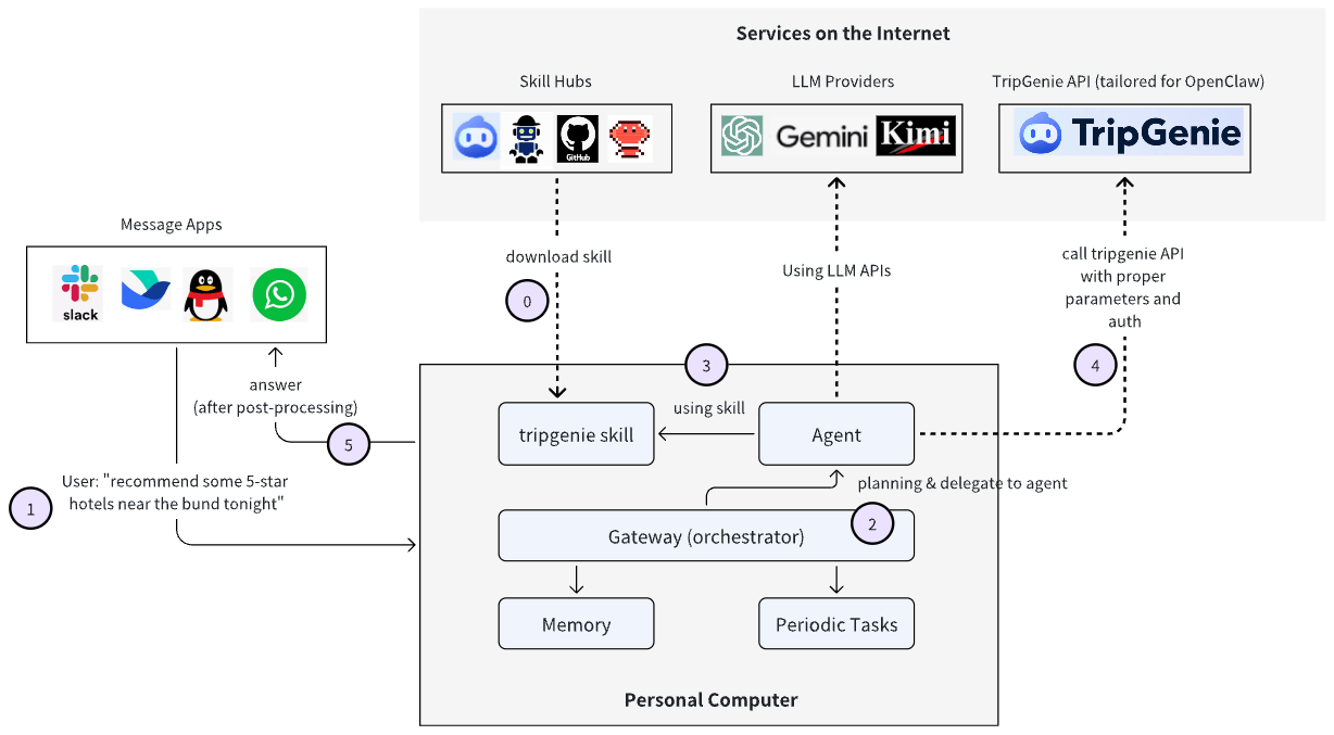 user), 随着跟这个人的交互越来越频繁,也会越来越了解这个人;这进一步要求它要有记忆(memory); - 它工作在用户的个人设备/电脑上,所有状态都存储在本地,甚至模型都用本地部署的;
